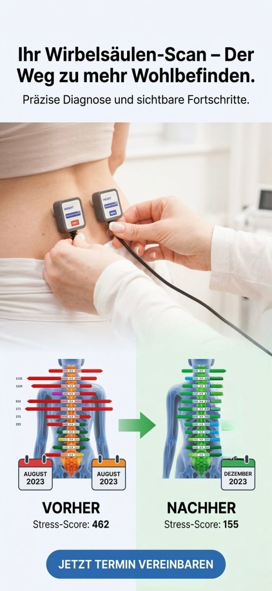 Wenn Sie Ihre Haltung, Muskelspannung und funktionellen Belastungsmuster genauer analysieren lassen möchten, kann ein Wirbelsäulenscan eine sinnvolle Ergänzung sein. Wir beraten Sie persönlich und prüfen gemeinsam, wie die Untersuchung in Ihren individuellen Behandlungsplan passt.
